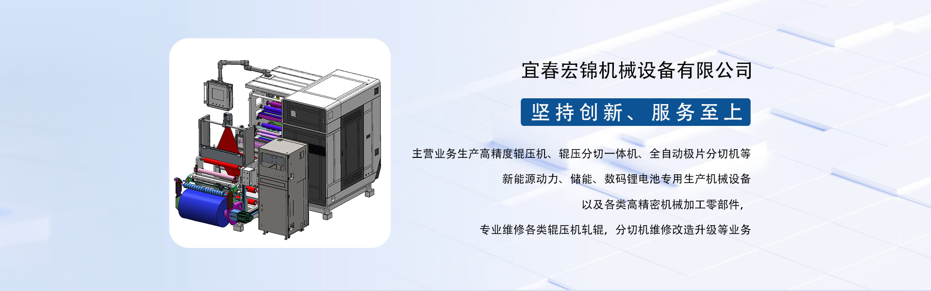 東莞市宏錦機械科技有限公司江西分公司是一家集研發、生產、銷售、服務于一體的創新型鋰電自動化精密機械設備專業制造、服務商,坐落于江西省新余市渝水區新余經濟開發區孵化園5號廠房,廠房面積近6000平米,由東莞市宏錦機械科技有限公司于2024年11月投資新建,交通區位優勢明顯、產業配套便捷集中,擁有一批具有行業豐富經驗的技術人員和管理團隊。公司主營業務生產高精度輥壓機、輥壓分切一體機、全自動極片分切機等新能源動力、儲能、數碼鋰電池專用生產機械設備以及各類高精密機械加工零部件,專業維修各類輥壓機軋輥,分切機維修改造升級等業務。根據公司發展三步走戰略規劃經營現下設三個二級獨立運營事業部分別為分切事業部(分切機、輥壓分切一體機)、磨輥事業部(輥壓機、軋輥修磨)、機加事業部(精密機械部件加工)。經過十余年沉淀發展主要客戶有新余贛鋒、南昌維科、宜春清陶、云南路華、河南恒一、江西程疆、四川天萊、蕪湖天弋、惠州億緯鋰能、無錫盤古新能源、鄭州比克、安徽鋰天下、臺灣長利(宏基集團)、重慶維都利(紫建電子)、贛州諾威、安徽利維能、漳州萬寶、重慶佳寶成、廣西皇冠儲能等一批具有行業知名度和影響力的企業。公司在新能源發展的道路上堅持創新,為客戶帶來穩定、高效的自動化專用設備和更大的收益。